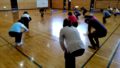 講師の動きに合わせて脳トレと準備体操を行いました。特に脳トレでは、左右非対称の動きに戸惑う場面が多々ありました。