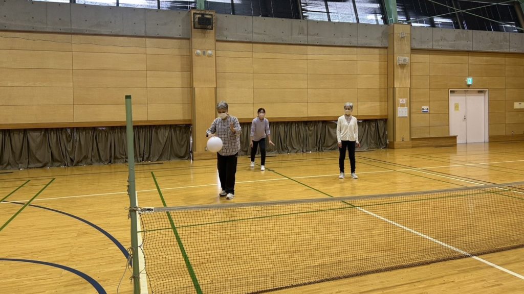 休憩をはさみ、次は「バウンスボール」を行いました。「バウンスボール」とは、コートに低いネットを張り、テニスのようにワンバウンドのボールを手のひらで打ち合う競技です。ワンバウンドするボールとの距離感が難しく、最初は皆さん苦戦していましたが、ローテーションで試合を重ねるごとにラリーが続くようになりました。
