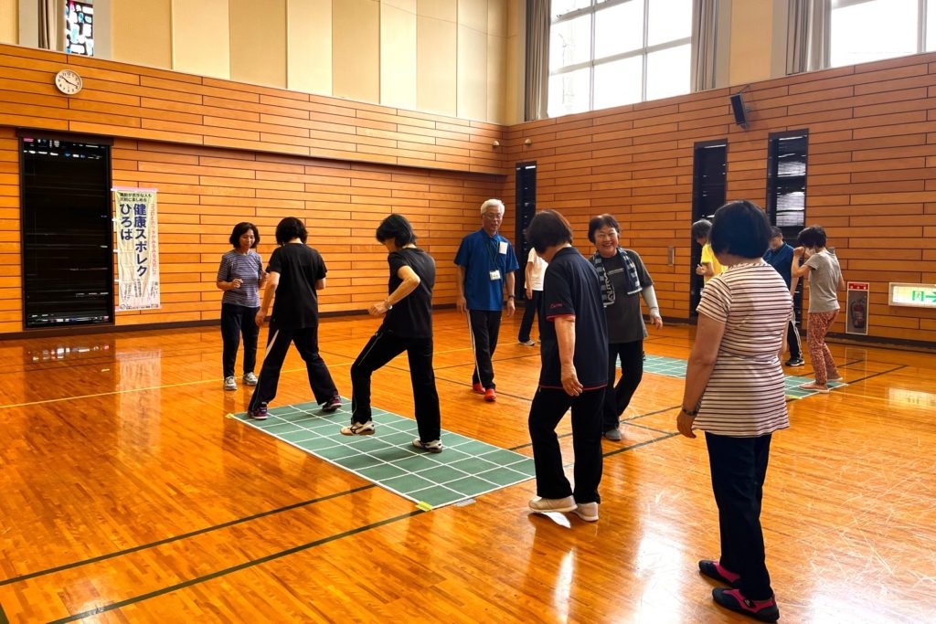 次に行われたのは「スクエアステップエクササイズ」。横4マス×縦10マスの縦長のマットの上を指導者のお手本通りに覚えてステップを踏んでいく「歩く脳トレ」です。見て、覚えて、考えて、体を動かすことで、脳と体を同時に活性化できます。皆で声を掛け合って、うまくできてもできなくても、ゴールできたら笑顔でハイタッチ。皆さん、生き生きと楽しんでいました。
