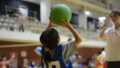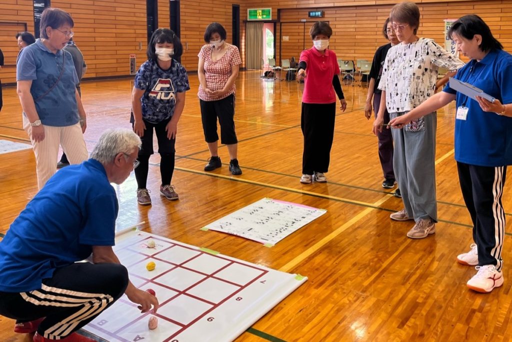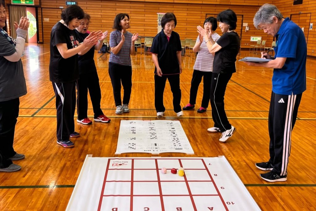 次の種目は「マットス」。お手玉のような4つのボールを16マスのマットに向かって投げ、並べた位置で「役」ができると高得点になる競技です。参加者同士、「次はここよ」「こっちでも大丈夫」などと声を掛け合い、協力して高得点を狙います。狙いを外すと皆でため息、高得点が出ると拍手が湧いたりと、とても和気あいあいと楽しんでいました。