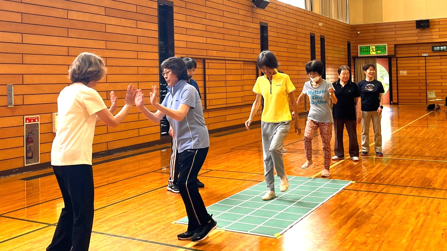 次に行われたのは「スクエアステップエクササイズ」。横4マス×縦10マスの縦長のマットの上を指導者のお手本通りに覚えてステップを踏んでいく「歩く脳トレ」です。見て、覚えて、考えて、体を動かすことで、脳と体を同時に活性化できます。皆で声を掛け合って、うまくできてもできなくても、ゴールできたら笑顔でハイタッチ。皆さん、生き生きと楽しんでいました。