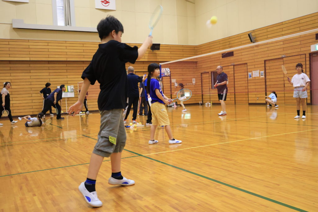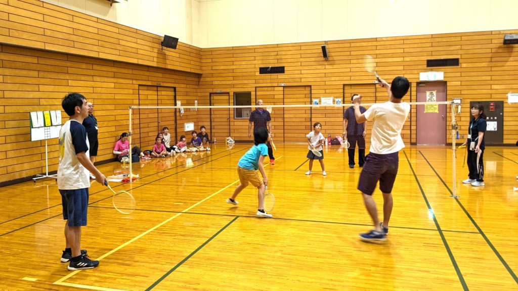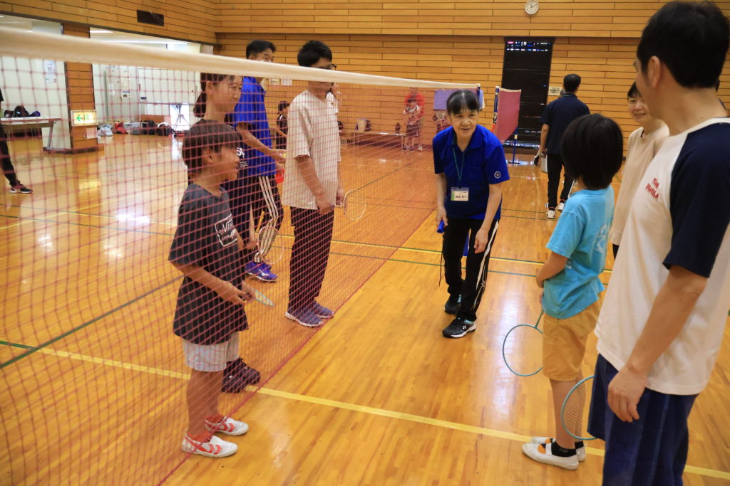 15家族、40名の方にご参加いただき、ファミリーバドミントン体験会を行いました。 ルール説明の後、家族ごとに3コートに分かれ、初めにボールを使ってラリーとサーブの練習をしました。シャフトの短いラケットにスポンジボールがついた羽を使いますが、低学年のお子さんには少し難しいサーブも、何度もチャレンジして相手コートに届くようになりました。