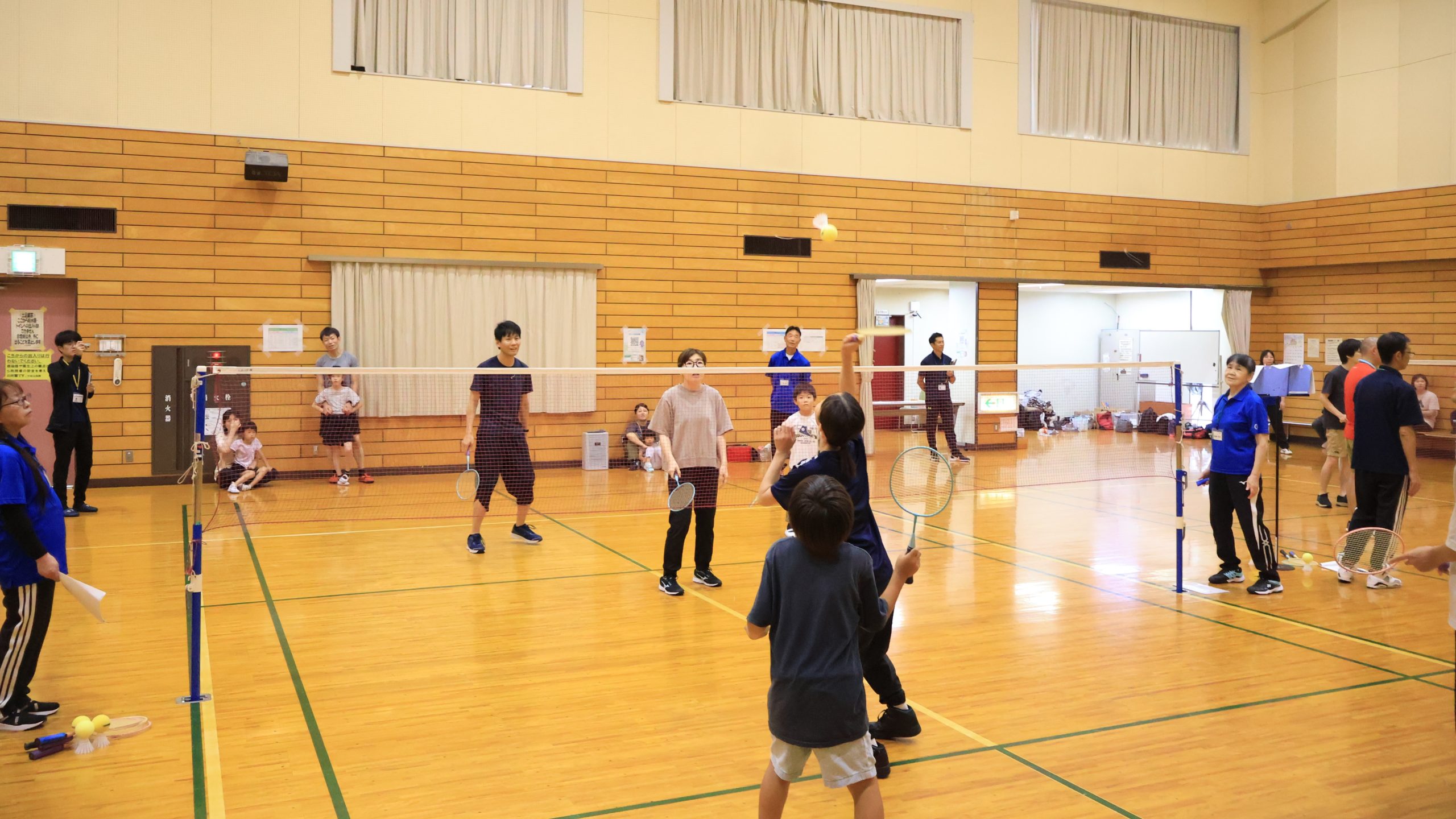 15家族、40名の方にご参加いただき、ファミリーバドミントン体験会を行いました。 ルール説明の後、家族ごとに3コートに分かれ、初めにボールを使ってラリーとサーブの練習をしました。シャフトの短いラケットにスポンジボールがついた羽を使いますが、低学年のお子さんには少し難しいサーブも、何度もチャレンジして相手コートに届くようになりました。