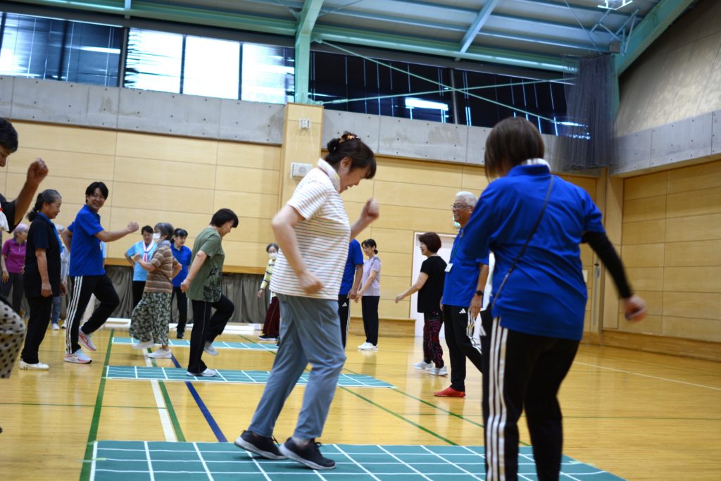 「中々(なかなか)、外々(そとそと)」と、どこを踏むかを周囲が声援でサポート。 「だんだん難しくなりますよ」と、ステップは前後や斜めに変化していきます。 これがなかなか難しく、頭も体も大忙し。意外といい運動になります。