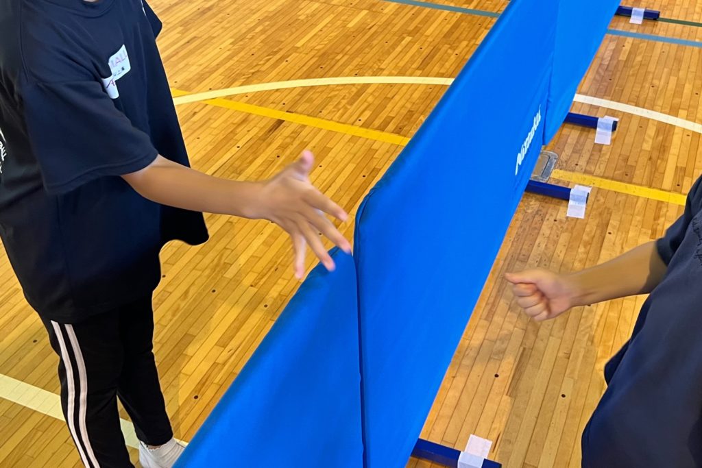 中学校の部活動地域展開事業の一環として、この日はバウンスボールに取り組みました。参加者は小学生5名と保護者3名でした。バウンスボールは、まだ誕生したばかりの新しい室内スポーツで、柔らかい専用ボールをワンバウンドさせ、手のひらで打ち返して楽しみます。事前に競技概要を送付していたため、参加者の皆さんにはおおよその内容を理解した上でご参加いただけました。